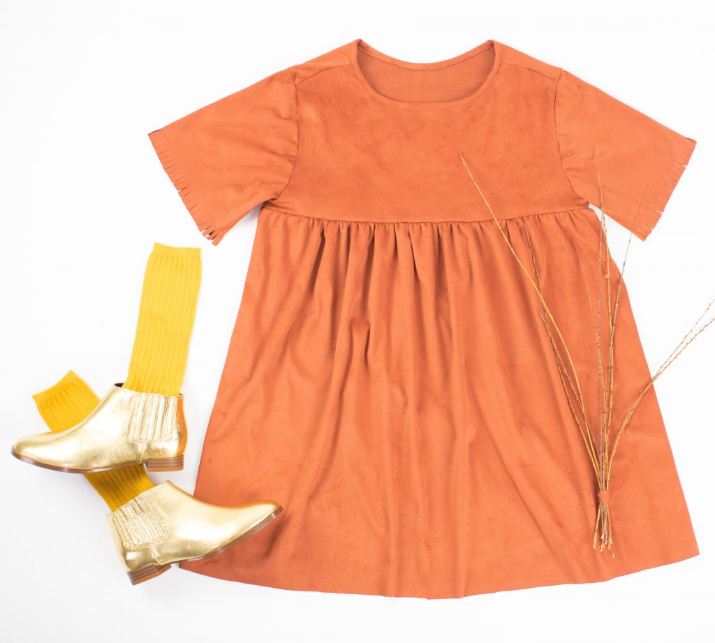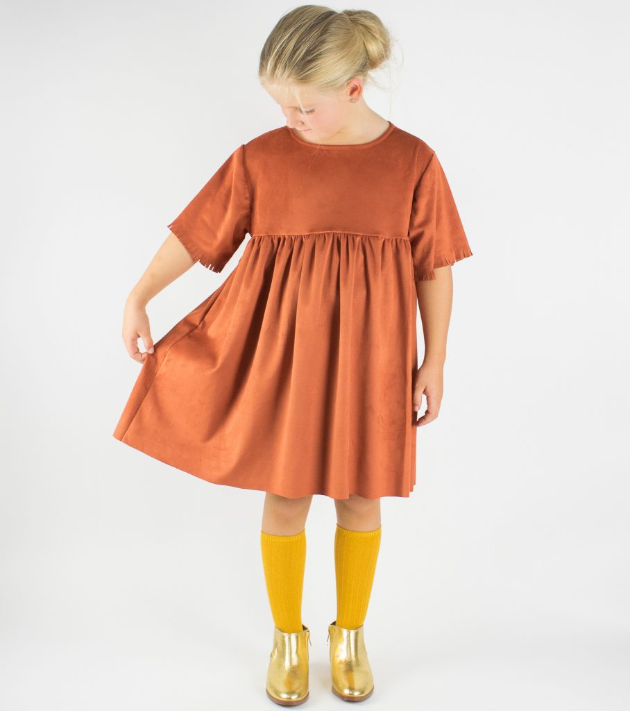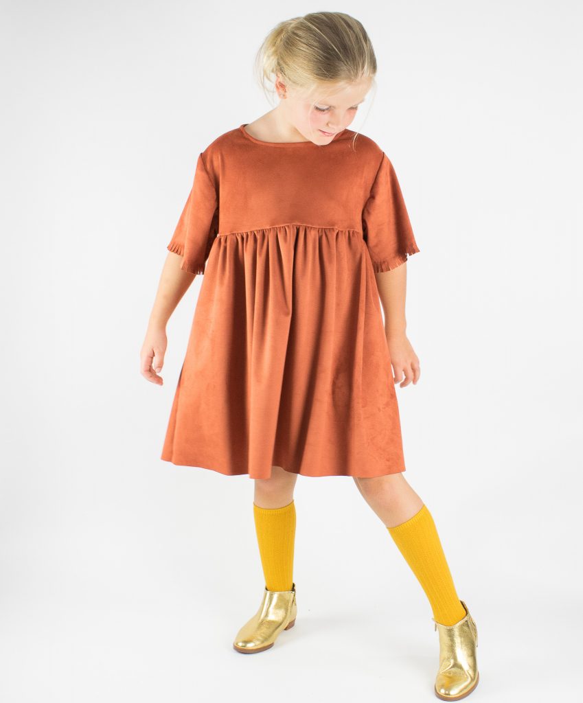 Na versie 1 volgde meteen versie 2 want ik vond het ideale stofje voor deze losse jurk, een licht elastische daim in de meest fantastische roestkleur.