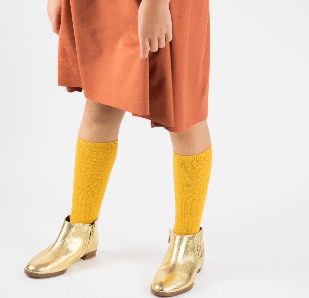 We combineerden hier met de gele kniekousjes en gouden schoenen maar eigenlijk past elke kleur kniekous hier wel bij, denk maar aan donkerblauw, bordeaux, donkergroen,..