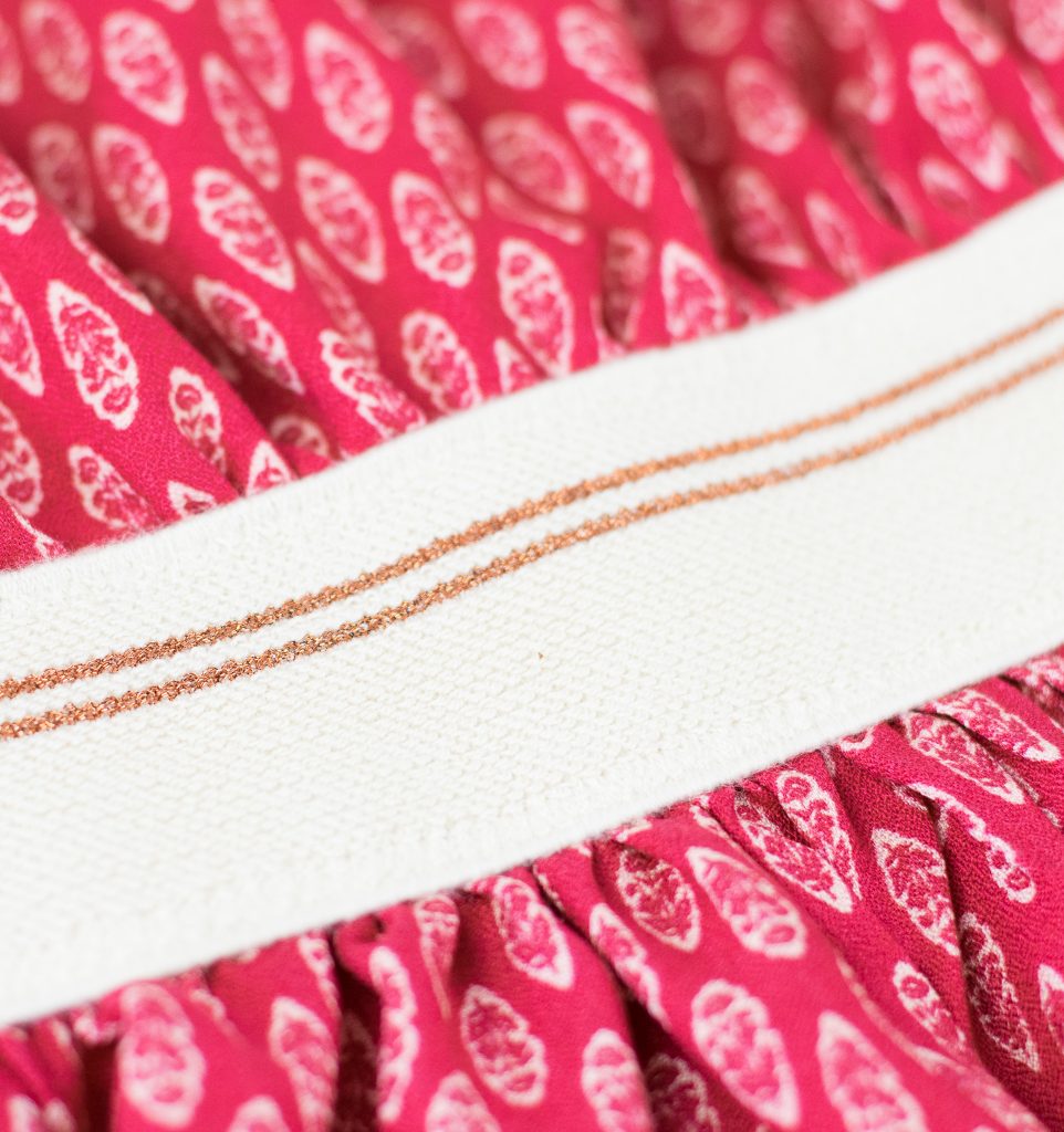 De kleur van de elastiek matcht met de blaadjesprint en het koperen accent geeft dat beetje bling aan de jurk.