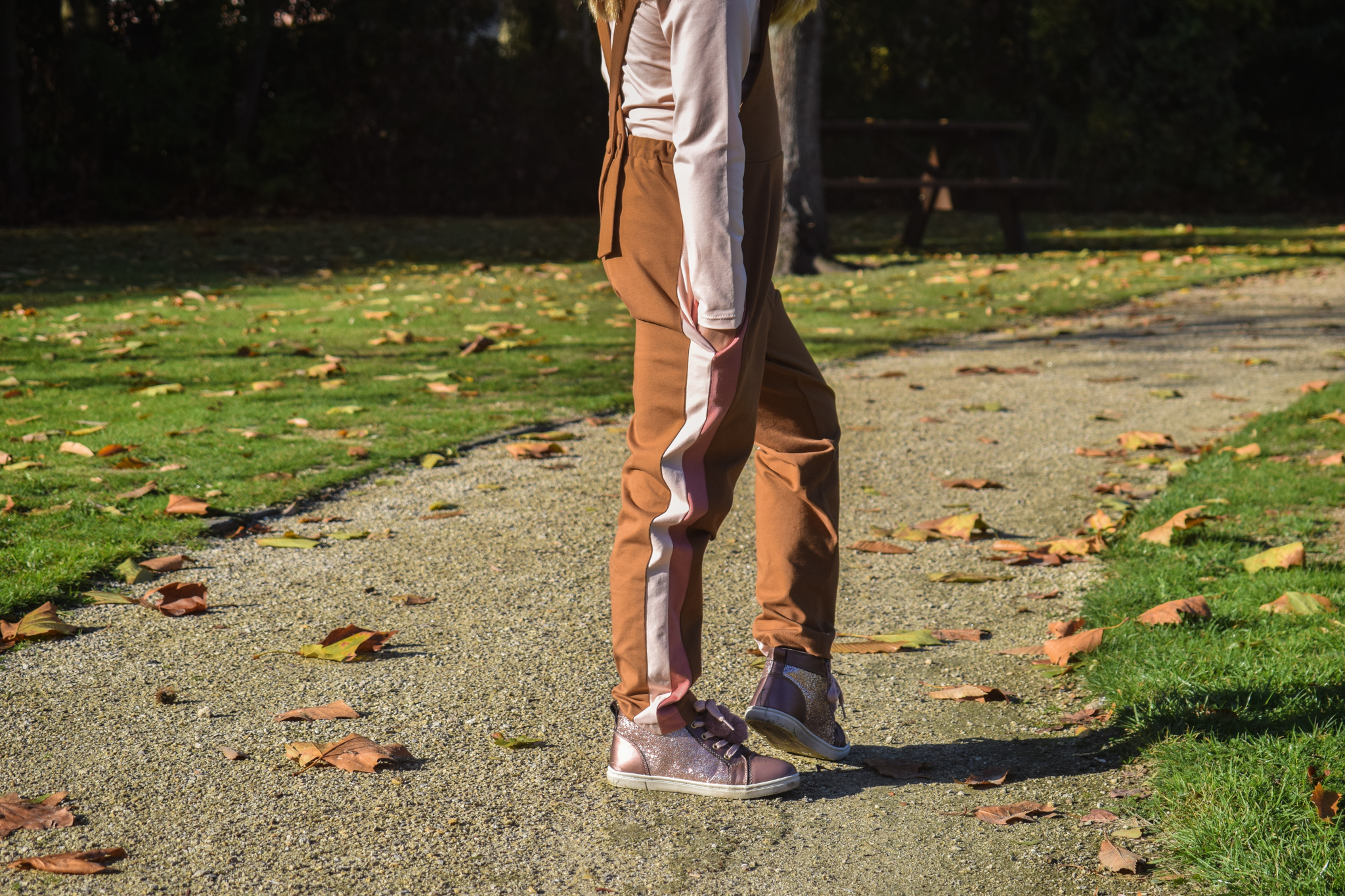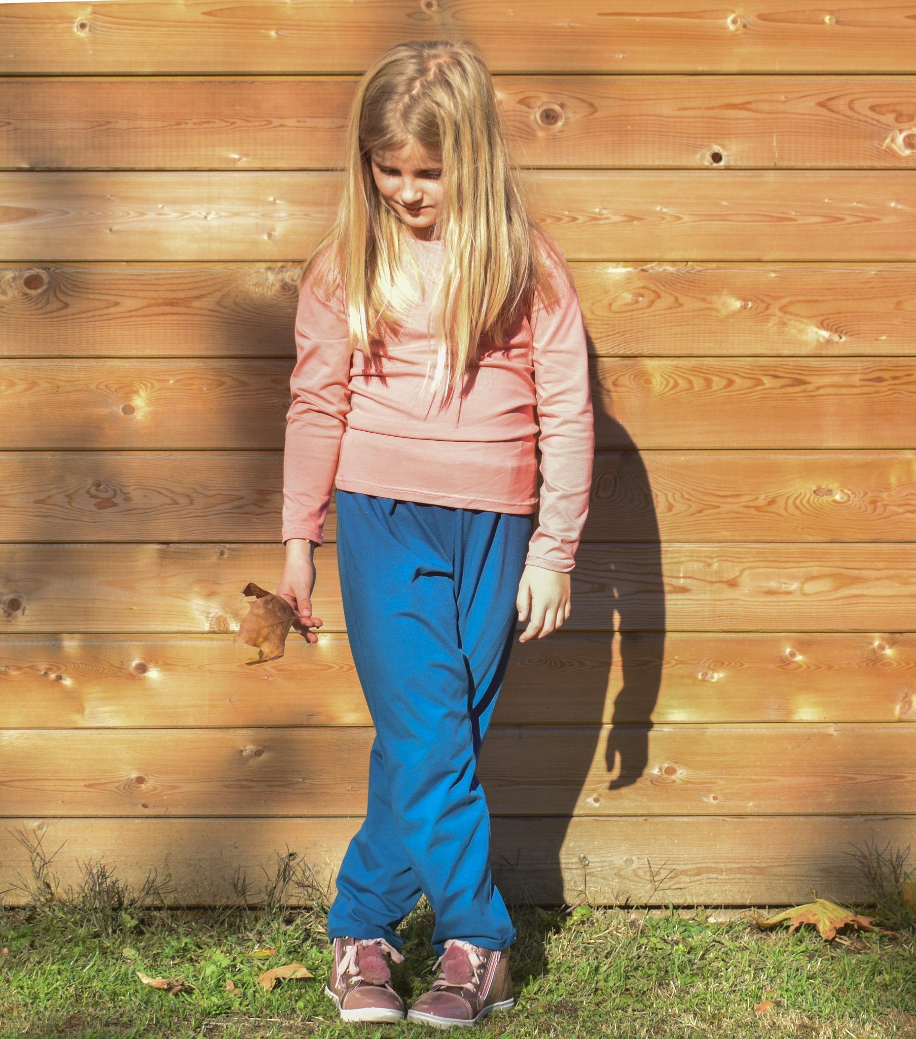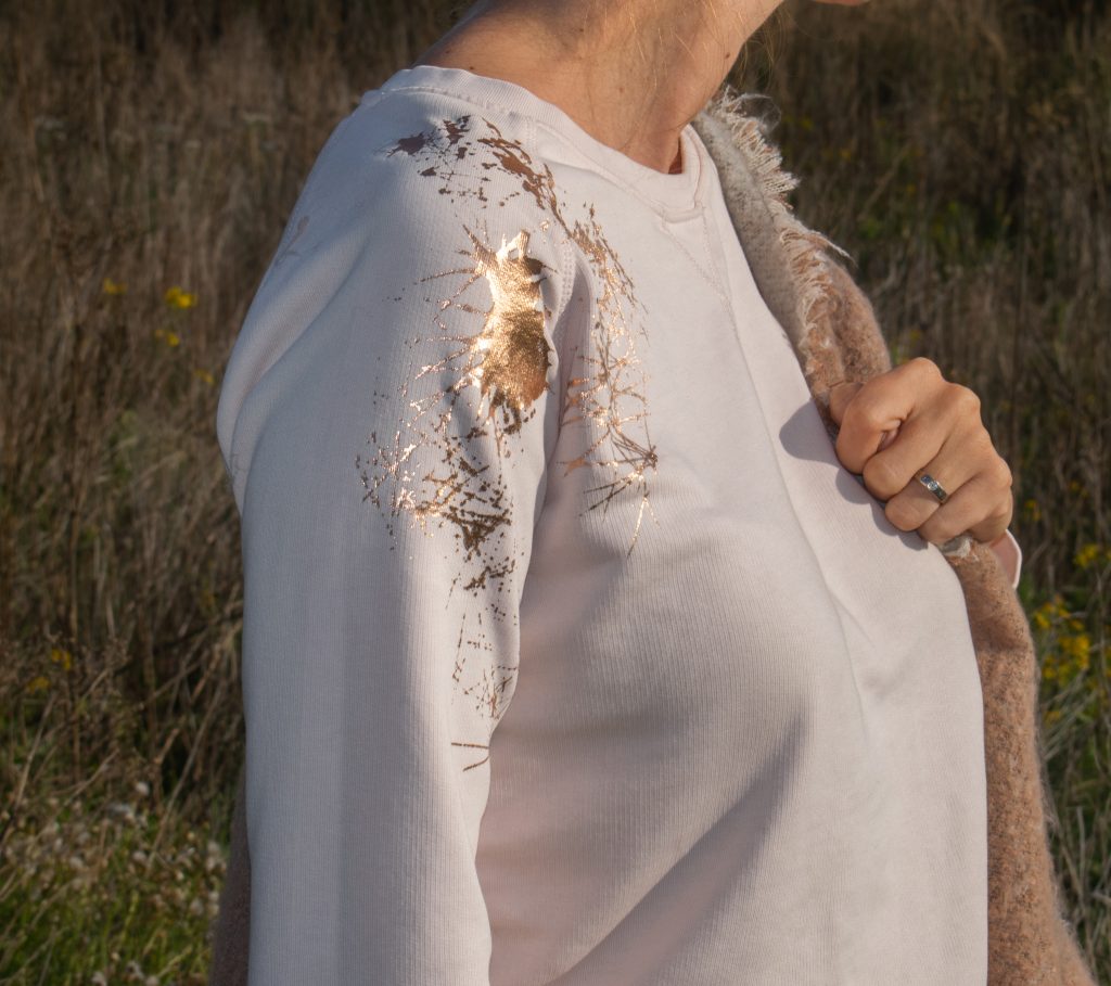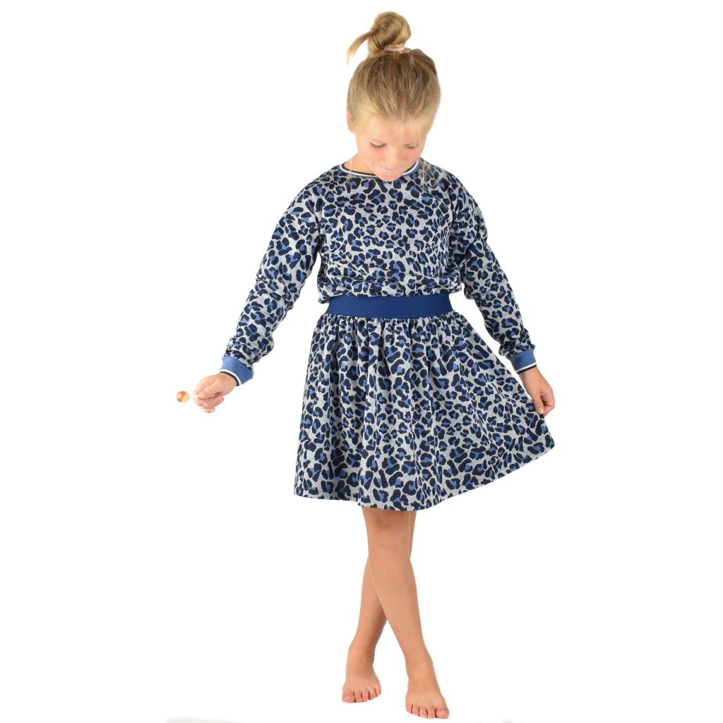 Het is een combinatie van licht stretchende jacquard (blauw), french terry (roze) en metallic french terry (goud).