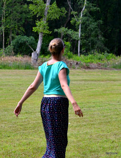 Ook het bijhorende shirt in muntgroene tricot maakte ik zelf.