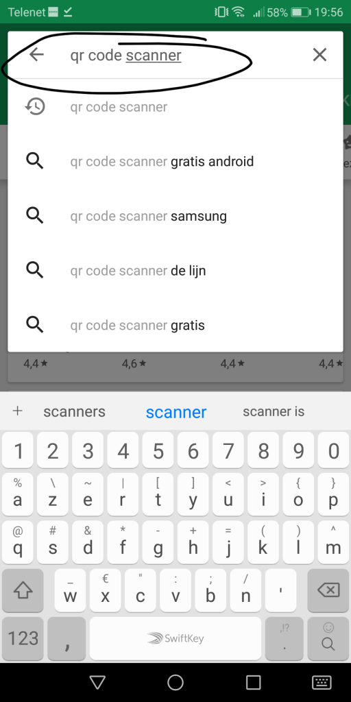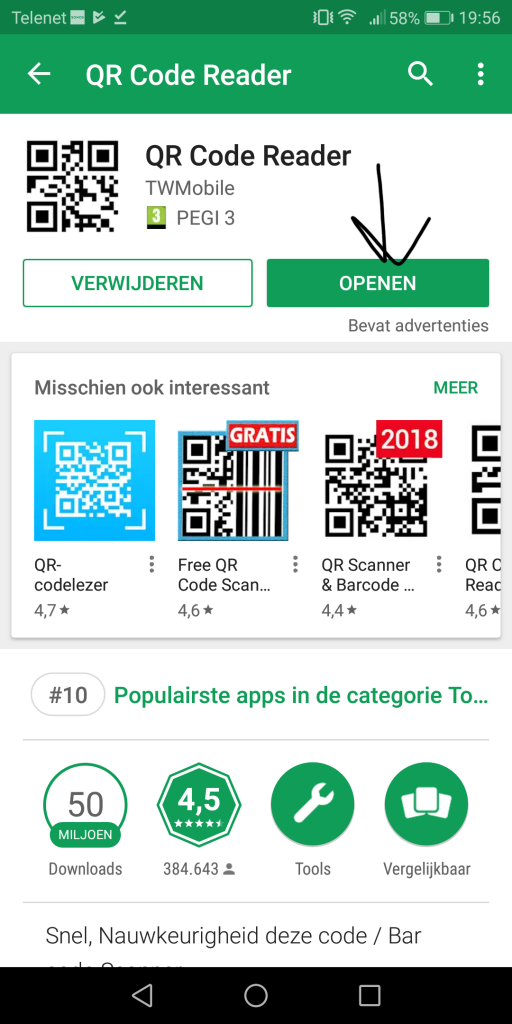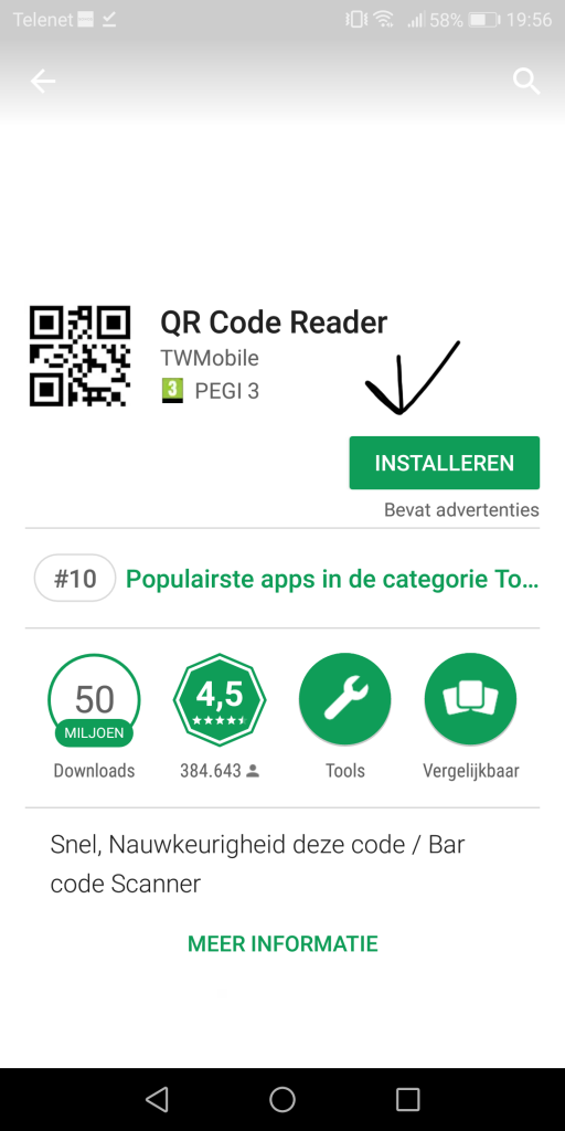 Ga daarvoor naar de playstore (android) of apple store (iphone) en typ in het zoekveld ‘QR code scanner’