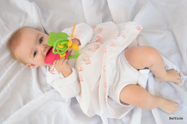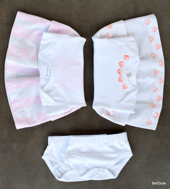 Ik stempelde dus wat figuurtjes in verschillende kleuren op de rompers en op het lakentje, kwestie van de witheid wat tegen te gaan ;-).