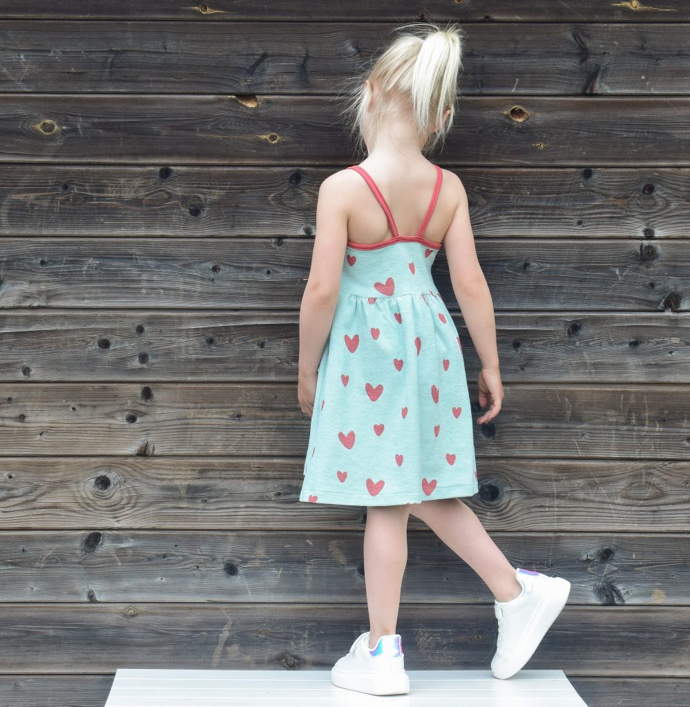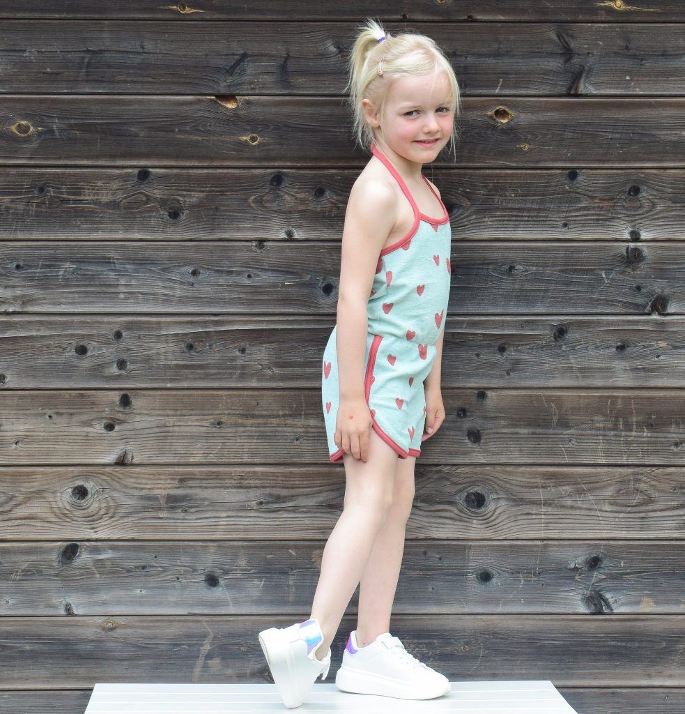Hoewel mijn grote meid ook wel fan was van het hartjesstofje, koos ik ervoor om een set te maken in de bijpassende uni kleur spons (badstof)