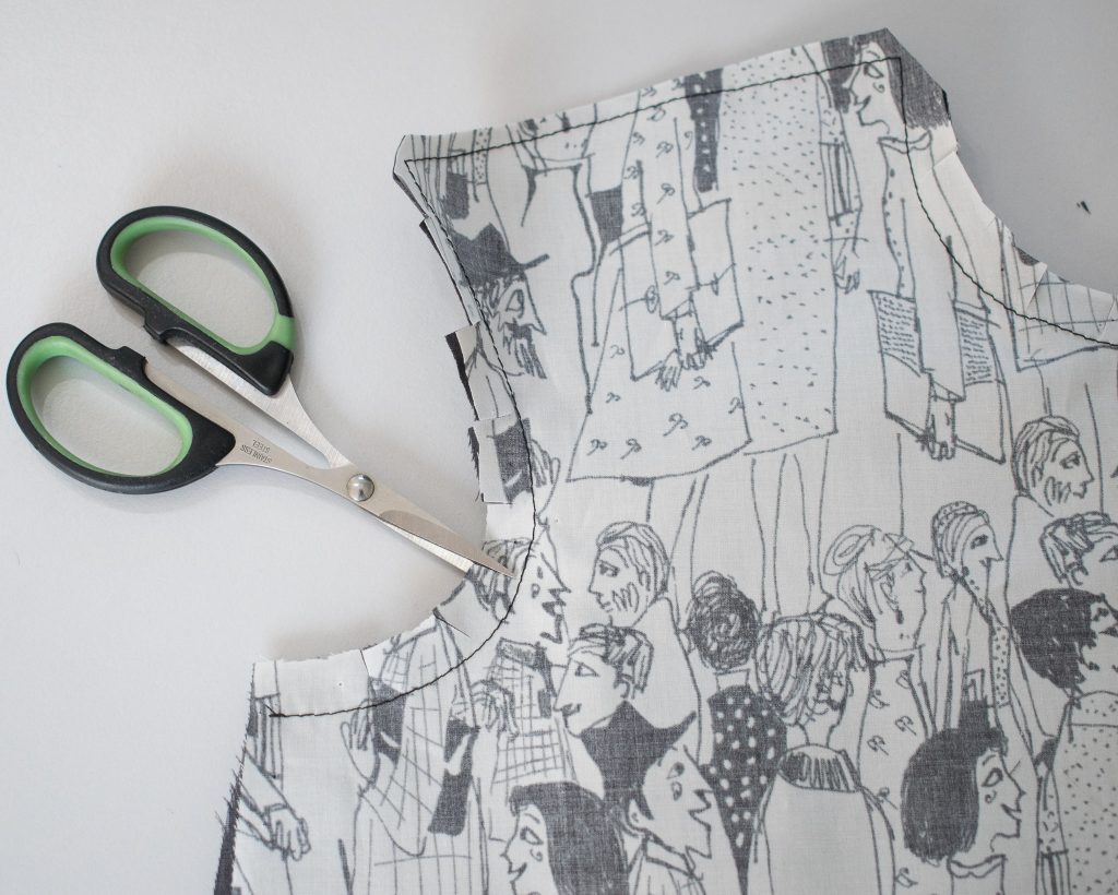 Geef een knipje in je V tot net voor het stiksel en geef ook knipjes in de rondingen van je naad.