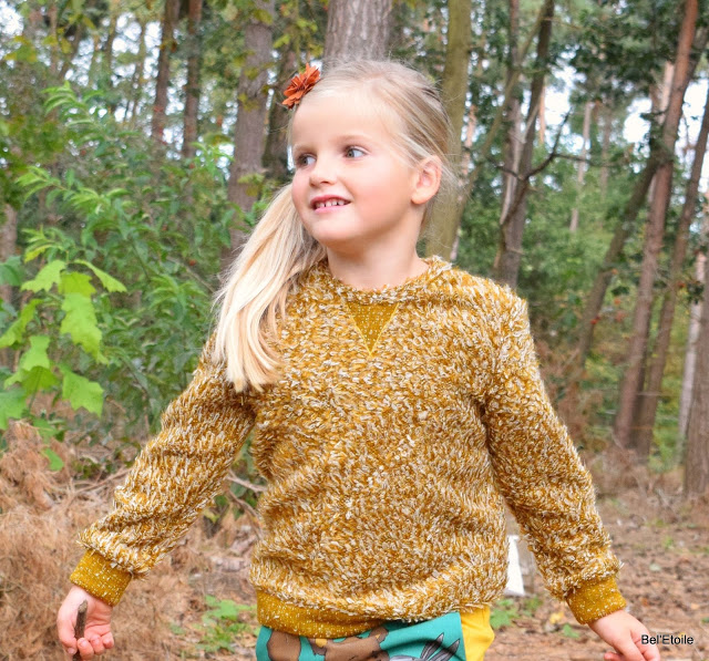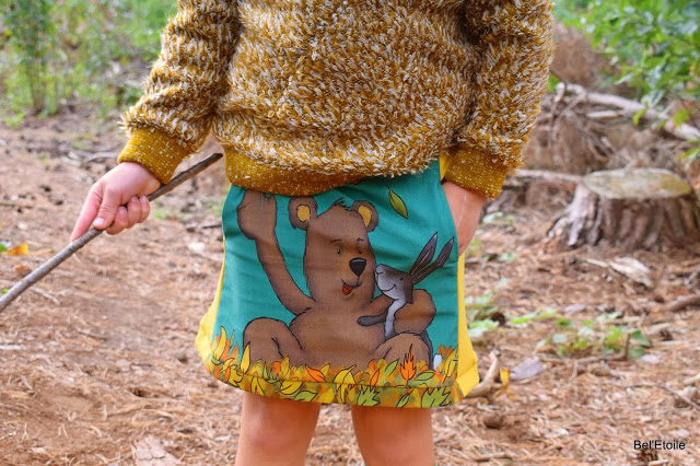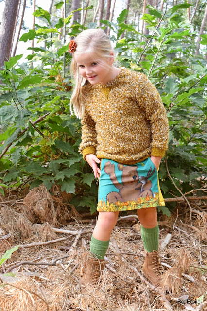 Stof rokje: berenpaneel Finch Fabrics (Miss Anaïs) – stof sweater: mosterdgeel breisel (Strass)